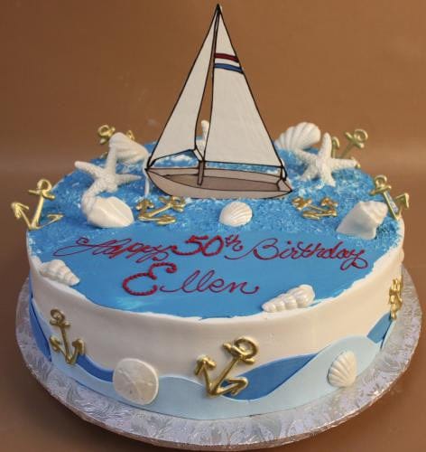 Waved blue frosting on top and white buttercream on side. Liquid chocolate standing sailboat with scattered white seashells and gold anchors. Rolled chocolate waves at base.