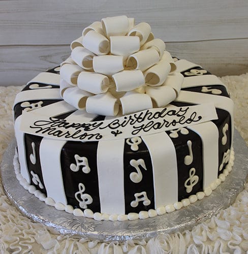 Chocolate ganache cover cake with white rolled chocolate crown bow and straps with white liquid chocolate musical notes in between.