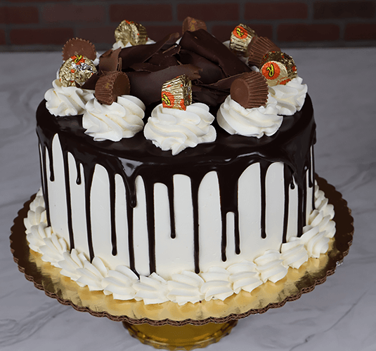 Chocolate cake with chocolate peanut butter mousse. White buttercream frosting with a ganache drip and chocolate peanut butter cups on top.