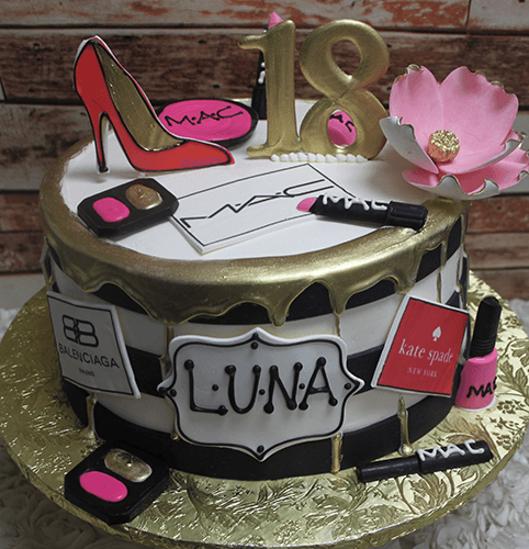Extra high cake with white buttercream frosting. Black bands on side with gold drip. Designer labels on side and top. Scattered make up and standing shoe. Liquid chocolate gold number with pink magnolia. Monogram on front side with name.