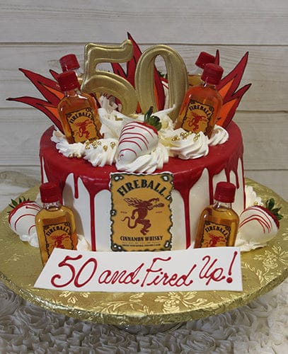 White buttercream frosting with a red drip. Gold number standing with a ring of Fireball nips alternating with white dipped strawberries. Liquid chocolate flames on top with the Fireball logo on side. Nips provided by our distributor “Wollaston Liquors”. Must be 21 to order and provide I.D. upon pick up.