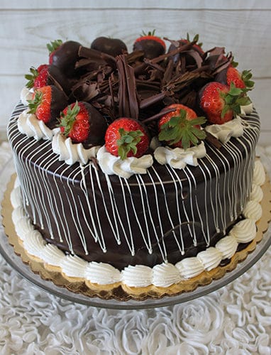 A luxurious chocolate ganache cake drizzled with white chocolate and topped with whipped cream, chocolate curls, and hand-dipped strawberries.