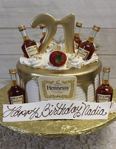 White buttercream frosting with a gold drip. Gold number standing with a ring of Hennessy nips alternating with white dipped strawberries. Hennessy logo on side. Nips provided by our distributor “Wollaston Liquors”. Must be 21 to order and provide I.D. upon pick up.
