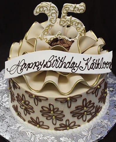 Ivory buttercream with ivory rolled chocolate ruffle edged gold. #25 ivory embellished gold standing on top. Chocolate flower design on side with gold dragees at peeks.