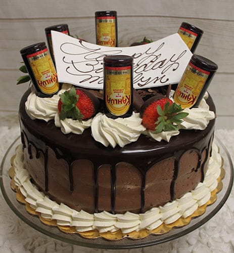 Chocolate buttercream frosting with ganache drip. Ivory rosettes with dipped strawberries alternating Kahlua nips. Nips provided by our distributor Wollaston Liquors. Must be 21 to order and provide I.D. upon pick up.