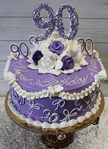 Lavender buttercream frosting. Bouquet of buttercream roses in lavender and white with white leaves. Liquid chocolate standing #90 on top, on bouquet and scattered on side.