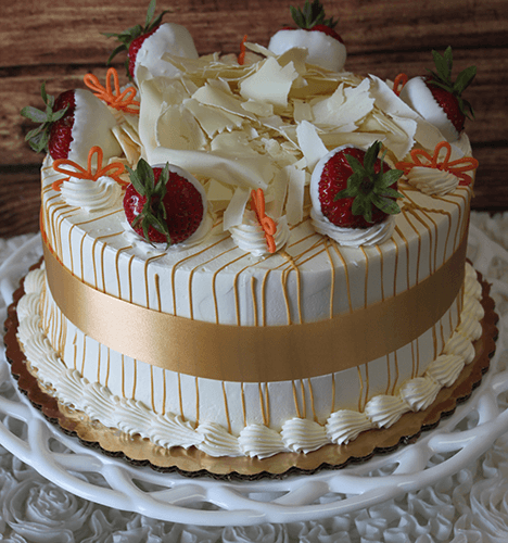 Gold cake filled with Mimosa mousse. White dipped strawberries alternating with orange chocolate filagrees.