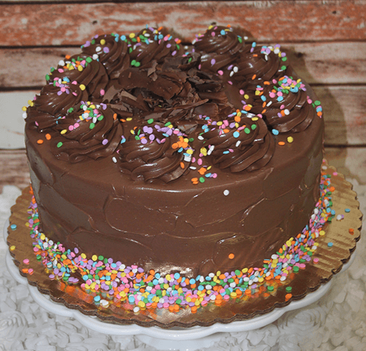 Gold cake layered with chocolate mousse filling. Textured chocolate buttercream frosting with chocolate rosettes and sprinkles.
