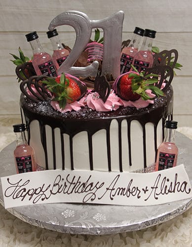 White buttercream with ganache drip. Liquid chocolate silver number standing with a ring of chocolate dipped strawberries and Pink Whitney nips. Nips provided by our distributor “Wollaston Liquors”. Must be 21 to order and provide I.D. upon pick up.