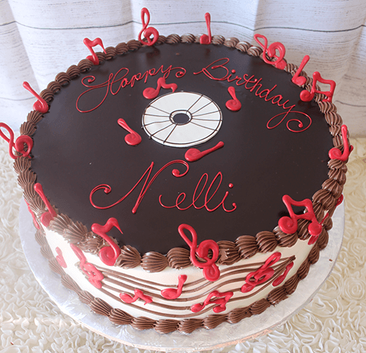 Ganache top with white buttercream sides . Rolled chocolate white record in center. Standing red music notes on top and on side