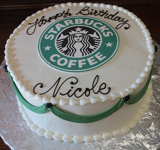 White buttercream frosting with Starbucks logo picture scan. Green swag on side.