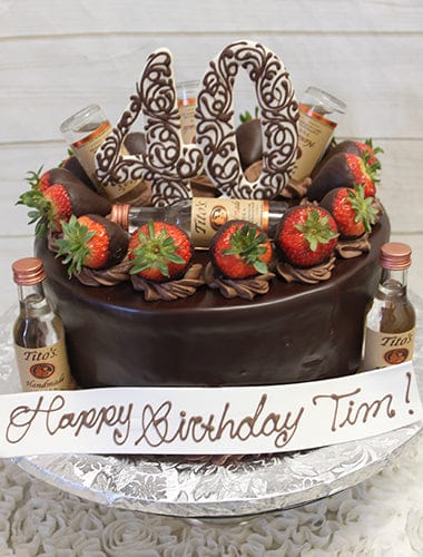 Ganache covering with a ring of chocolate covered strawberries. Standing liquid chocolate number with Titos nips scattered all over. Nips provided by our distributor “Wollaston Liquors”. Must be 21 to order and provide I.D. upon pick up.