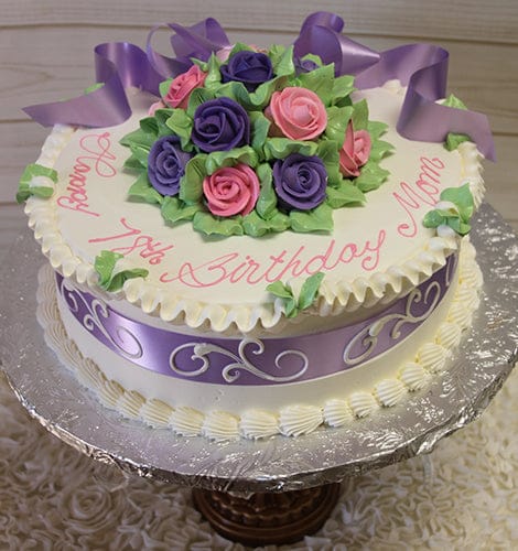 White buttercream frosting with a bouquet of pink and lavender buttercream roses and pale green leaves. Lavender ribbon on side with ribbon bow on top. Finished with a white buttercream swag. White scroll on ribbon.