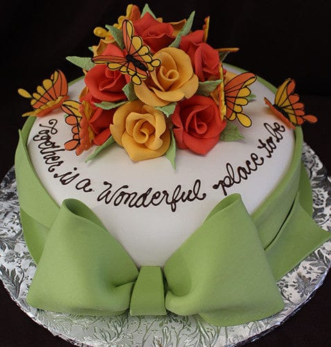 White rolled chocolate cover with a bouquet of bright orange and mustard yellow rolled chocolate roses with green leaves. Orange and yellow monarch butterflies on bouquet and some on top. Rolled chocolate olive green wrap and bow on side.