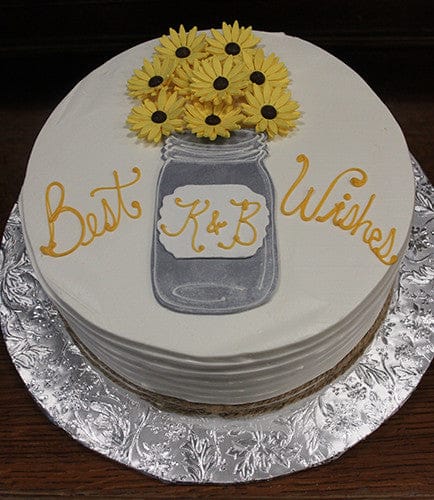 White buttercream frosting with horizontal texture on side and twine. Silver rolled chocolate mason jar with white monogram and yellow sunflowers. Please specify letters for monogram in inscription drop down bar.