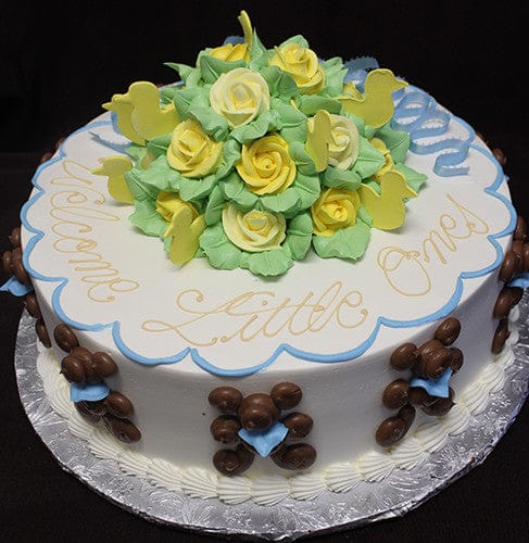 Bouquet of yellow buttercream roses with green leaves. Yellow ducks in bouquet with blue eyelet ribbon on top and blue scallop border. Boy bears on side with blue bow ties.