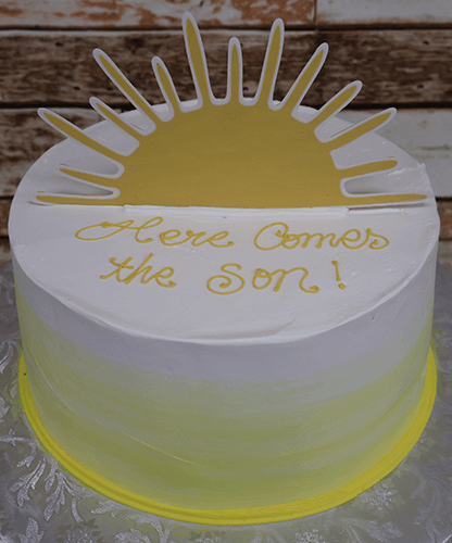 Extra high cake with ombre yellow frosting. Here comes the Son.