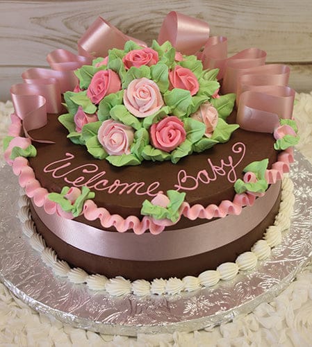 Chocolate buttercream frosting. Bouquet of shades of pink buttercream roses with green leaves, light pink ruffle swag border with light pink ribbon on top and side.