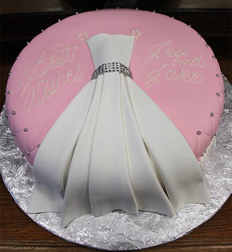Pink rolled chocolate cover with white rolled chocolate dress with silver crystal band on top draping down side. Quilted pattern on side with silver dragˆš©es at corners.