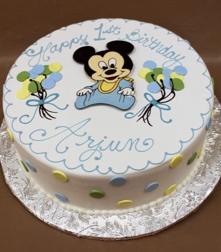 White buttercream frosting. Liquid chocolate baby Mickey Mouse character in center. Pale green, pale yellow, and light blue rolled chocolate balloons on top on either side of character. Pale green scallop border on top edge. Rolled chocolate polka dots on side in pale green, pale yellow and light blue. White shell border at base.