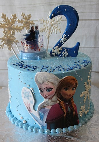 Extra high cake with light blue buttercream frosting. Anna and Elsa picture scan on side with piped snowflakes. Frozen figure on top with standing number.