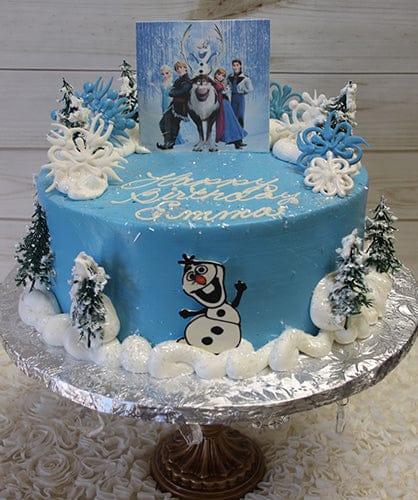 Blue buttercream frosting with edible photo scan of Frozen characters standing. White buttercream snow all over.