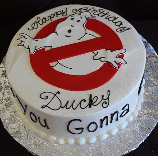 White buttercream frosting with rolled chocolate Ghostbusters logo on top. On side written “Who you gonna call?