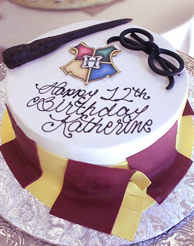 White buttercream frosting with rolled chocolate Harry Potter theme.