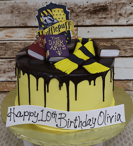 Extra high cake with yellow frosting and ganache drip. Hufflepuff design.