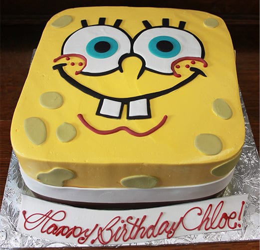 Yellow buttercream frosting with Sponge Bob face. Square cake.