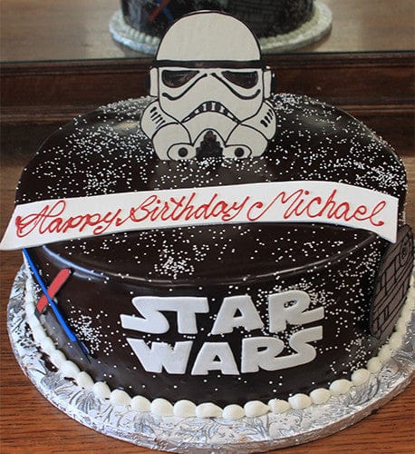 Ganache covering with storm trooper face standing on top. Rolled chocolate star wars logo on front side and liquid chocolate light sabers and death stars on side.