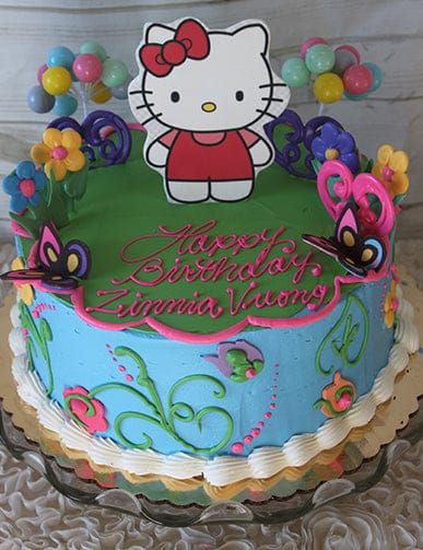 The SC-026 Hello Kitty cake features colorful flowers, butterflies, and a Hello Kitty topper. “Happy Birthday Zinnia Vuong” is written in pink icing. Multicolored balloon decorations appear in the background.Hello Kitty