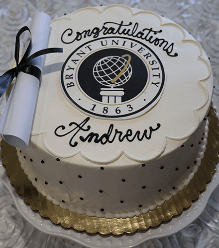 White buttercream frosting with blacks dots on side and diploma with black ribbon. School logo on top.