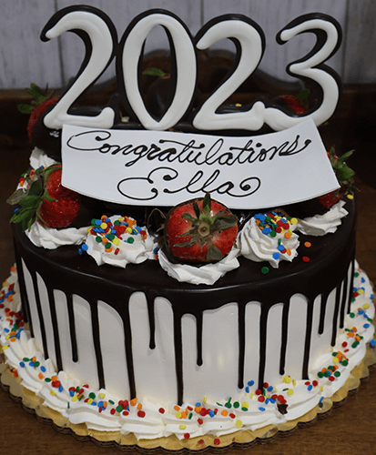 White buttercream frosting with ganache drizzle. Chocolate covered strawberries alternating white rosettes with confetti. Confetti at base with standing chocolate 2021 on top.