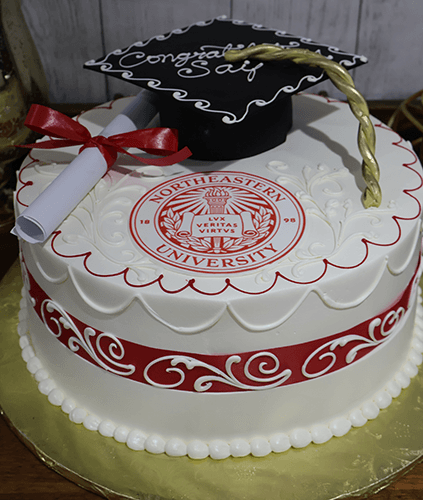 Rolled chocolate black grad cap with gold tassel. Red scallop border with school logo and ribbon diploma. White scallop border on side top edge with Red ribbon and white scroll on side