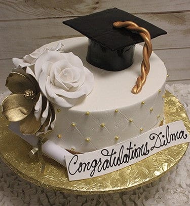 White buttercream frosting with quilted design and gold dragees. Black cap on top with gold tassel. White chocolate roses and a gold painted magnolia on side. Diploma and writing at base.