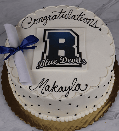 White buttercream frosting with blacks dots on side. School logo on top.