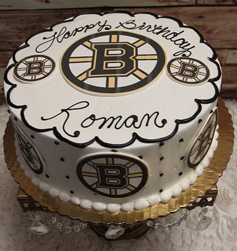 Boston Bruins logos on top and on side with black scallop border on top and black swiss dots on side.