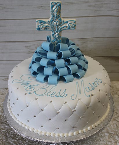 White rolled chocolate cover with a light blue rolled chocolate crown bow on top. Standing solid cross embellished blue on top of bow. Quilted pattern on side with silver dragees at peaks