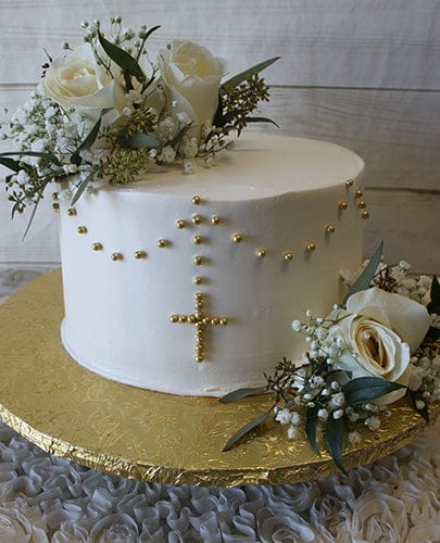Extra high cake with white buttercream frosting. Gold dragee swag with gold cross. Bouquets of fresh white roses, babies breath and seeded eucalyptus.