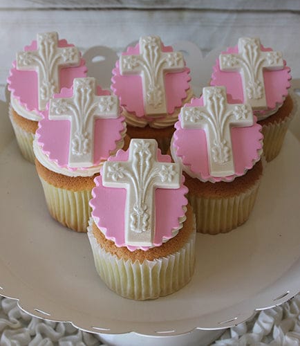 Gold cupcake with chocolate mousse filling with white buttercream rosette. Pink monogram with white chocolate cross.
