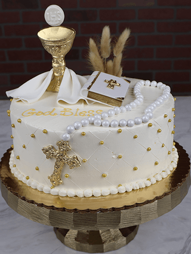 White buttercream with quilted design and gold dragees. Standing chalice with bible and rosary beads.