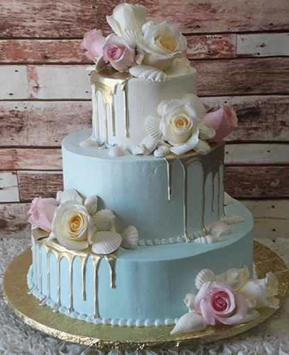 Wedding or any occasion cake serving 75 people. Ombre style aqua blue buttercream frosting with a gold drip. Bouquets of fresh pink and white roses with white chocolate seashells.