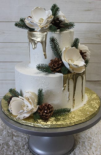Petite wedding or any occasion cake serving 25-30 people. White buttercream frosting with alternating gold drips. Bouquets of white magnolias accented with gold and pinecones/greenery. Edible glitter sprinkled all over.
