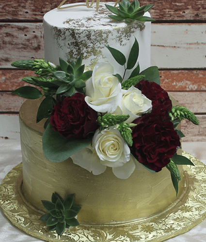 Petite wedding or any occasion cake serving 25-30 people. Extra high cakes with white buttercream frosting. The bottom layer is painted with edible gold and the top layer is finished with accents of gold. Bouquet on side with fresh red and white roses. Finished off with greens and scattered mini succulents.