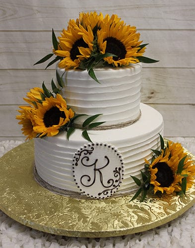 Petite wedding or any occasion cake serving 25-30 people. White horizontal buttercream frosting with bouquets of fresh sunflowers and greenery. Twine wrapped around each layer with a white ornate monogram at base. Please indicate letter or letters for monogram in the inscription box. Select “custom.”