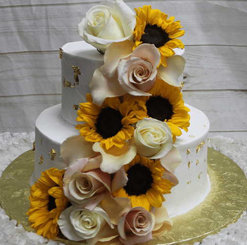 Petite wedding or any occasion cake serving 25-30 people. White buttercream frosting with gold leaf scattered. Cascade of fresh sunflowers with white and blush pink roses.