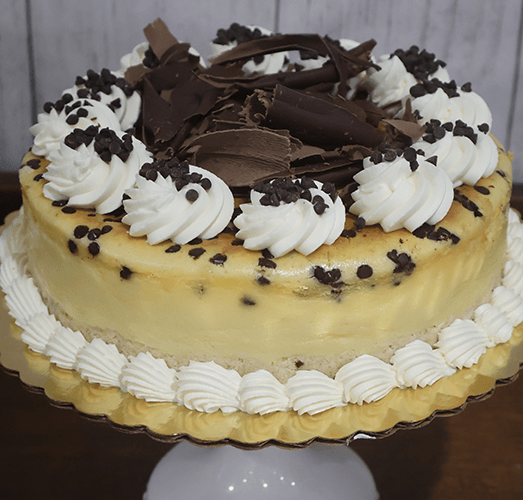 Chocolate chip cheesecake with a ring of whipped cream rosettes and chocolate chips.