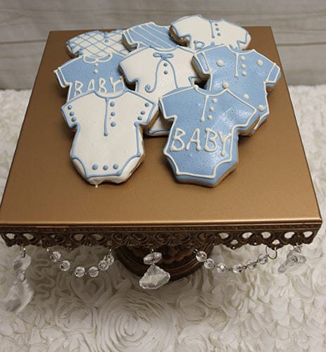 Onesie cookie. Sugar cookies dipped in white and light blue chocolate with baby design. These cookies are not bagged.