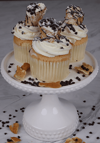 Gold cupcake filled with ricotta. Garnished with ricotta cream. mini chocolate chips, ganache and a piece of cannoli shell.